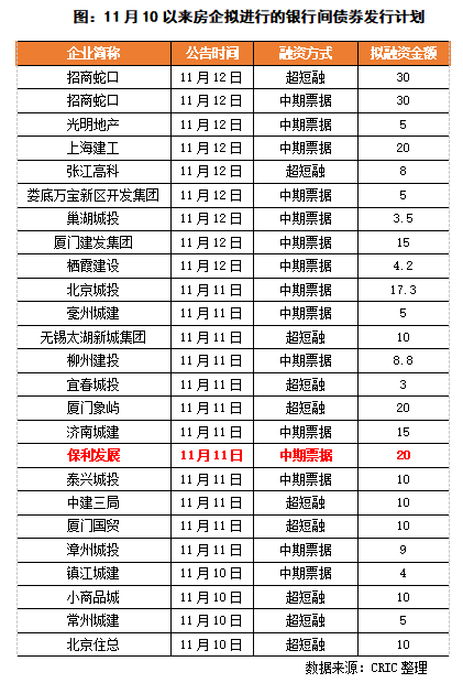 銀行間商協(xié)會座談會后,眾多房企密集發(fā)行中期票據(jù)和超短融資券。11月10日,常州城建、北京住總、小商品城宣布擬發(fā)行超短融資券,鎮(zhèn)江城建公告擬發(fā)行4億元的中期票據(jù);到11月11日,保利發(fā)展宣布擬發(fā)行20億元的中期票據(jù),將銀行間債券市場的融資主體從城投擴展到主流房企,而后11月12日,光明地產(chǎn)宣布擬發(fā)行5億元中期票據(jù),招商蛇口公告擬分別發(fā)行30億元的中期票據(jù)和超短融,企業(yè)融資“冰凍”狀態(tài)有所緩解。
