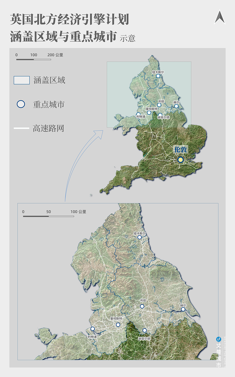 此計(jì)劃涉及以曼徹斯特、利物浦、利茲、紐卡斯?fàn)柕瘸鞘袨楹诵牡挠⒏裉m北部11個(gè)地區(qū)及北威爾士。