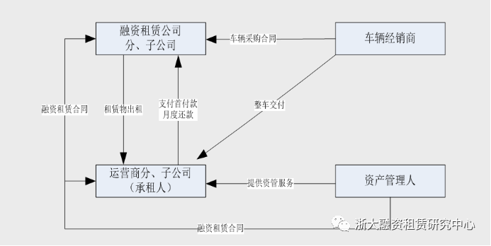 這一模式采用了直租,由融資租賃公司作為出租人向經(jīng)銷商采購車輛,車型全部為同一車型,車輛完成登記上牌后,統(tǒng)一交付至承租人日常運(yùn)營,同時(shí)委托平臺運(yùn)營商作為資產(chǎn)管理人,負(fù)責(zé)對車輛的日常運(yùn)營情況進(jìn)行監(jiān)控管理。