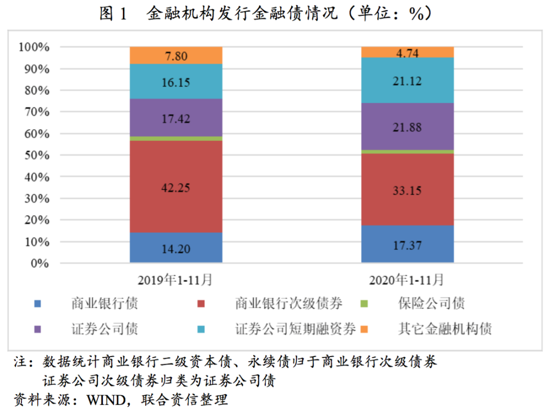 截至2020年11月末,整個債券市場發(fā)行規(guī)模共計發(fā)行39.55萬億元,共發(fā)行只數(shù)4.37萬只,其中金融債占債券市場份額達(dá)16.53%。從金融債券行業(yè)類型來看,2020年1-11月,商業(yè)銀行金融債發(fā)行量(含次級債和普通債券)占比達(dá)50.52%,同比小幅下降5.93個百分點,證券公司發(fā)行量(公司債、短期融資券)占比達(dá)43.00%,同比增長9.43個百分點,其他金融機構(gòu)及保險公司發(fā)債規(guī)模低于10%。