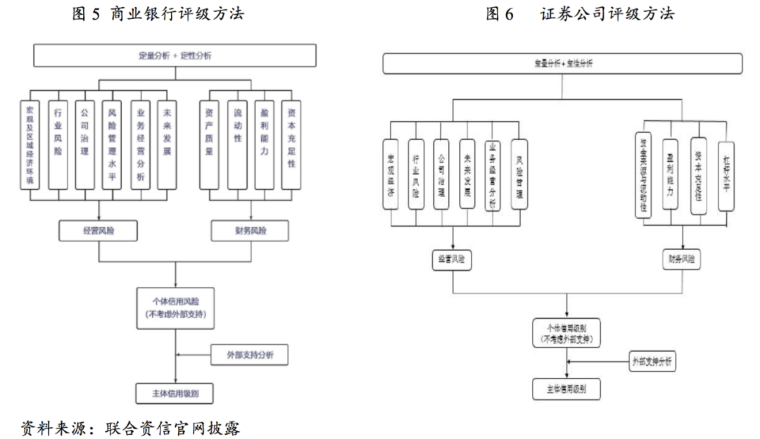 根據(jù)聯(lián)合資信官網(wǎng)披露的商業(yè)銀行和證券公司評級方法都是以定量結(jié)合定性分析,經(jīng)營風(fēng)險和財務(wù)風(fēng)險矩陣的形式得到該行業(yè)自身個體信用等級,再通過外部支持分析得到主體信用等級。經(jīng)營風(fēng)險方面,商業(yè)銀行面臨宏觀和區(qū)域風(fēng)險、行業(yè)風(fēng)險、公司治理水平、風(fēng)險管理水平、業(yè)務(wù)經(jīng)營狀況、未來發(fā)展能力將影響銀行的信用風(fēng)險;通常情況下面臨的宏觀和區(qū)域風(fēng)險越低、行業(yè)風(fēng)險越低、公司治理及風(fēng)險管理能力越強、業(yè)務(wù)經(jīng)營情況越好、未來發(fā)展能力越好的銀行,其經(jīng)營風(fēng)險越低。財務(wù)風(fēng)險方面,銀行自身的資產(chǎn)質(zhì)量、資本結(jié)構(gòu)、盈利能力、流動性水平將影響銀行的信用風(fēng)險;通常情況下,資產(chǎn)質(zhì)量較高、資本充足、盈利能力較強、流動性水平較好的銀行,其財務(wù)風(fēng)險較低。