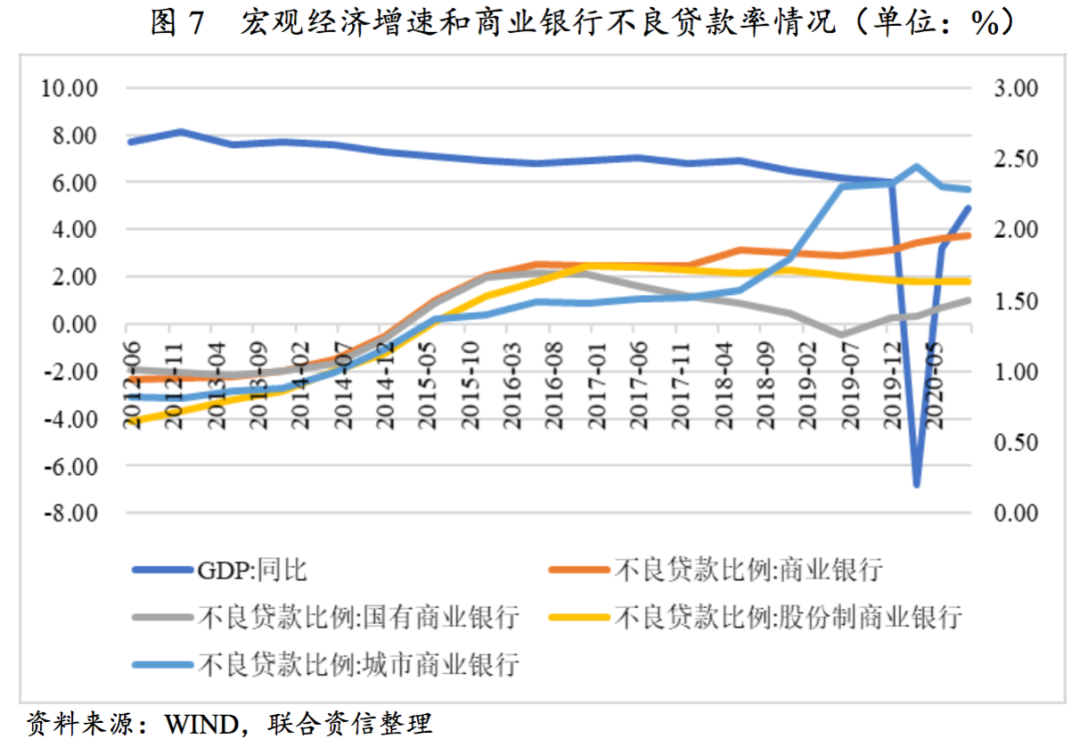 我們選取了宏觀經(jīng)濟增速與商業(yè)銀行不良貸款率對比,明顯發(fā)現(xiàn)宏觀經(jīng)濟增速與商業(yè)銀行不良貸款率為負(fù)相關(guān),宏觀經(jīng)濟越好,商業(yè)銀行不良貸款率越低。2012-2014年宏觀經(jīng)濟增速達(dá)7%以上,整體商業(yè)銀行不良貸款率約1.00%左右,但隨著2015年宏觀經(jīng)濟增速的逐步放緩,商業(yè)銀行不良貸款率也逐步開始攀升。截至2015年末,GDP增速為6.90%,商業(yè)銀行不良貸款率增至1.67%。2016-2019年,宏觀經(jīng)濟增速持續(xù)下行,截至2019年末商業(yè)銀行不良貸款率攀升至1.86%,其中農(nóng)商行主要屬地經(jīng)營為主,區(qū)域經(jīng)濟環(huán)境差異化較大,不良貸款率攀升至2.32%。2020年一季度受新冠疫情影響,GDP增速為-6.80%,雖第二、三季度有所回升,但未來商業(yè)銀行整體資產(chǎn)質(zhì)量仍承壓。