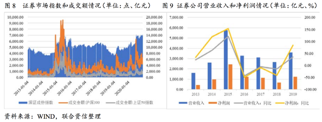 證券公司經(jīng)營表現(xiàn)與證券市場關(guān)系緊密,隨著市場下行和成交量的低迷,全行業(yè)證券公司營業(yè)收入和凈利潤自2015年開始連續(xù)三年下滑;2016-2018年,全行業(yè)證券公司營業(yè)收入均有所下滑,三年同比下滑42.97%、5.08%和14.47%,凈利潤分別同比下滑49.57%、8.47%和41.04%。2019年證券市場交易額的回升證券公司全年實現(xiàn)營業(yè)收入3604.83億元,凈利潤1230.95億元,分別較2018年增長35.37%和84.77%。