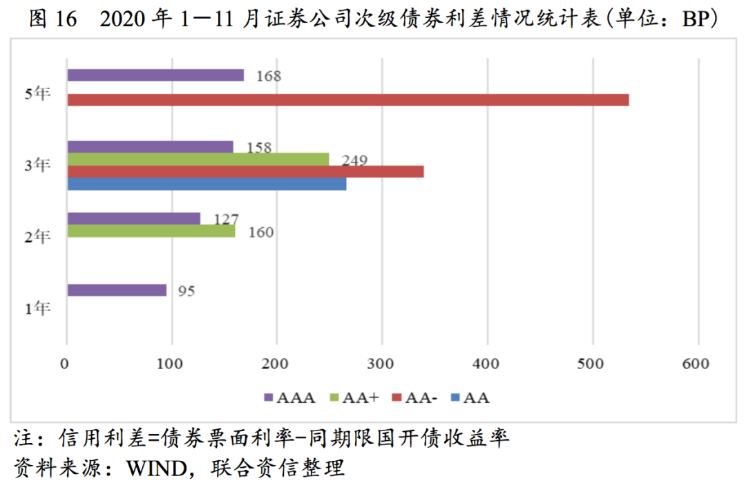 2020年1-11月,證券公司次級債發(fā)行期限1~5年,1年期次級債均為主體信用級別AAA級證券公司發(fā)行。兩年期次級債券AAA級證券公司信用利差低于AA+級33BP,3年期次級債券AAA級信用利差低于AA+級別91BP。5年期AA-主體信用級別樣本較少,個體差異化影響較大。通過商業(yè)銀行和證券公司發(fā)行次級債券信用利差對比,國有商業(yè)銀行和股份制商業(yè)銀行信用利差最低,商業(yè)銀行信用級別之間的利差低于證券公司,但5年期AAA級證券公司次級債券信用利差低于AAA級城商行和農(nóng)商行分別為8BP和28BP。