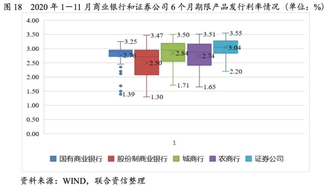 短期限產(chǎn)品中,股份制商業(yè)銀行利率均值最優(yōu),3個月期限產(chǎn)品證券公司發(fā)行利率均值優(yōu)于國有銀行、城商行和農(nóng)商行。6個月、9個月期限產(chǎn)品,證券公司與農(nóng)商行和城商行發(fā)行利率均值差距較小。