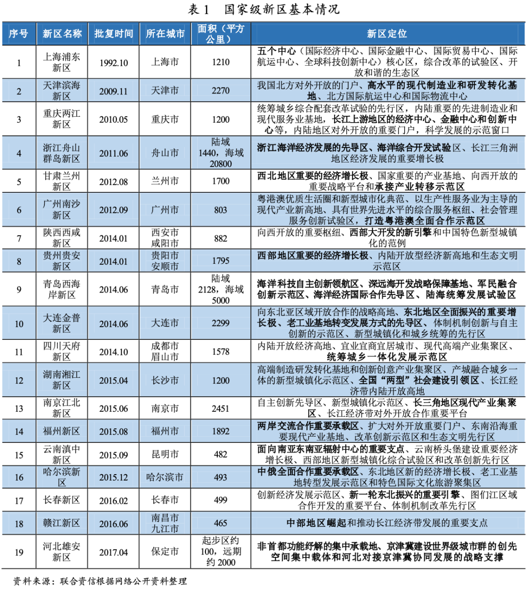 國家級新區(qū)是由國務院批準設立,承擔國家重大發(fā)展和改革開放戰(zhàn)略任務的綜合功能區(qū)。自1992年上海浦東新區(qū)獲批以來,我國已有19個國家級新區(qū)。國家級新區(qū)規(guī)劃面積大、范圍廣,資源環(huán)境承載能力強,作為引領區(qū)域經濟發(fā)展的新引擎,其長期規(guī)劃發(fā)展得到了多方位的保障。