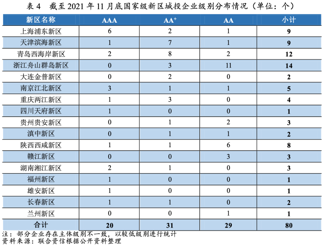 從主體信用級別分布看,AA+和AAA的城投企業(yè)占比近62%。其中,AAA級城投企業(yè)主要分布在浦東新區(qū)、濱海新區(qū)、西海岸新區(qū)、江北新區(qū)等經濟財政實力較強的國家級新區(qū),貴安新區(qū)、贛江新區(qū)和蘭州新區(qū)等新區(qū)受制于經濟發(fā)展水平較低、財政實力較弱等因素,城投企業(yè)主體信用級別以AA為主。