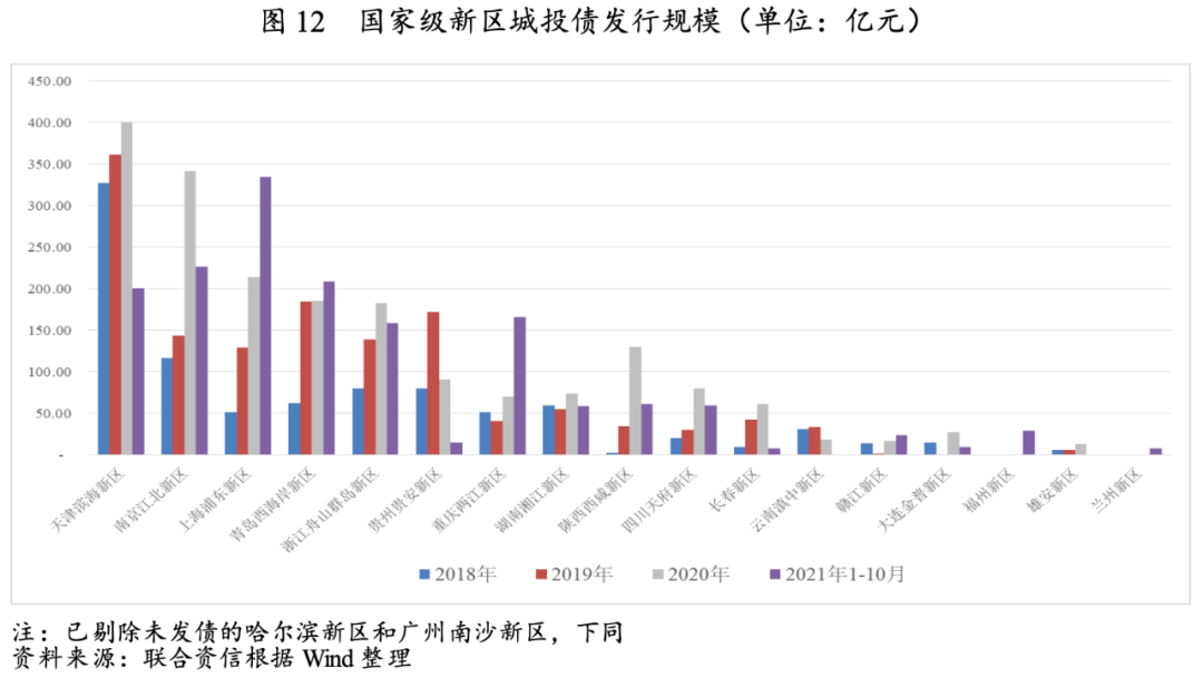 從凈融資規(guī)模來看,國家級新區(qū)城投債凈融資情況分化明顯,2018年至2021年10月底,金普新區(qū)、兩江新區(qū)、濱海新區(qū)和長春新區(qū)城投債凈融資為負。其中,兩江新區(qū)2020年以來城投債集中到期、償還量較大導致報告期間城投債累計凈融資為負;金普新區(qū)、濱海新區(qū)和長春新區(qū)則更多受區(qū)域融資環(huán)境拖累。同期,其他新區(qū)城投債融資均呈凈流入狀態(tài),江北新區(qū)和西海岸新區(qū)城投債凈融資規(guī)模均超過450億元,明顯領先于其他新區(qū);滇中新區(qū)及蘭州新區(qū)城投債凈融資規(guī)模較小。