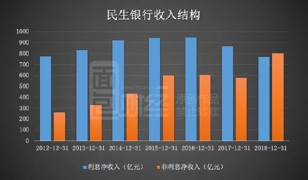 年報顯示,民生銀行的利息凈收入為766.8億元,較上年同期下滑了11.41%;非利息凈收入達800.89億元,較上年同期增長了38.73%。