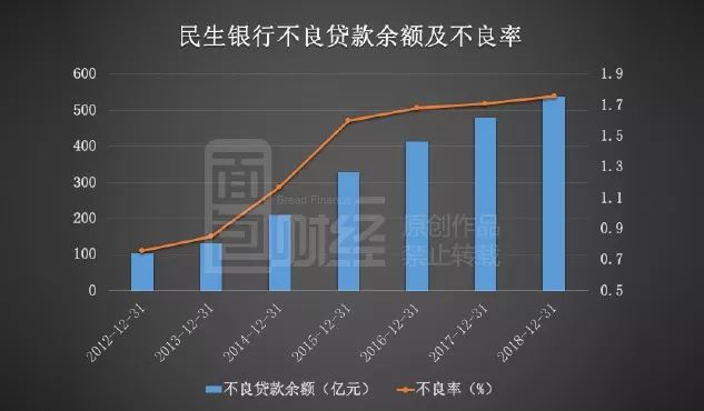 年報顯示,截至2018年底,民生銀行的不良貸款余額為538.66億元,較上年同期增加了59.77億元,增幅為12.48%。不良率為1.76%,較上年末上升0.05個百分點。