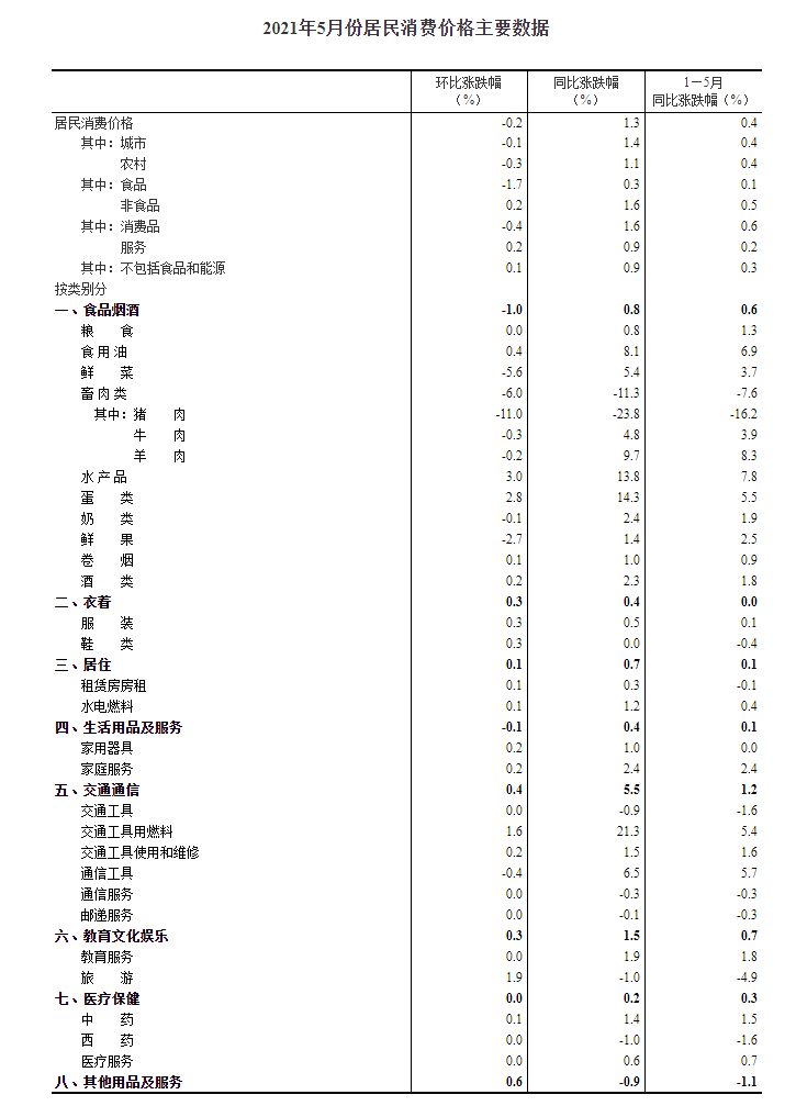 數(shù)據(jù)顯示,2021年5月份,全國(guó)居民消費(fèi)價(jià)格同比上漲1.3%。具體來說:食品價(jià)格上漲0.3%,非食品價(jià)格上漲1.6%;消費(fèi)品價(jià)格上漲1.6%,服務(wù)價(jià)格上漲0.9%。