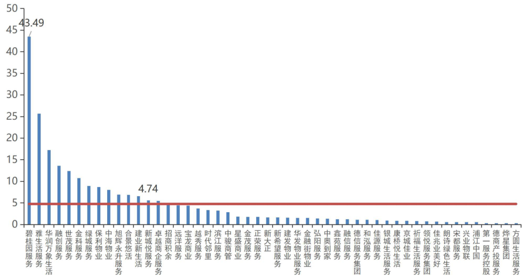 2021年披露年度在管面積的49家上市物企中,在管規模超過億平方米量級的物企達16家,超過均值(1.10億平方米)的物企為14家。其中,碧桂園服務在管面積達7.66億平方米,躍居上市物企在管規模之首;雅生活服務、保利物業和綠城服務在管面積均超過3億平方米;在管面積前五的企業規模總值達23.05億平方米,在上市物企中總規模占比超四成,上市物企的分化日益加大。