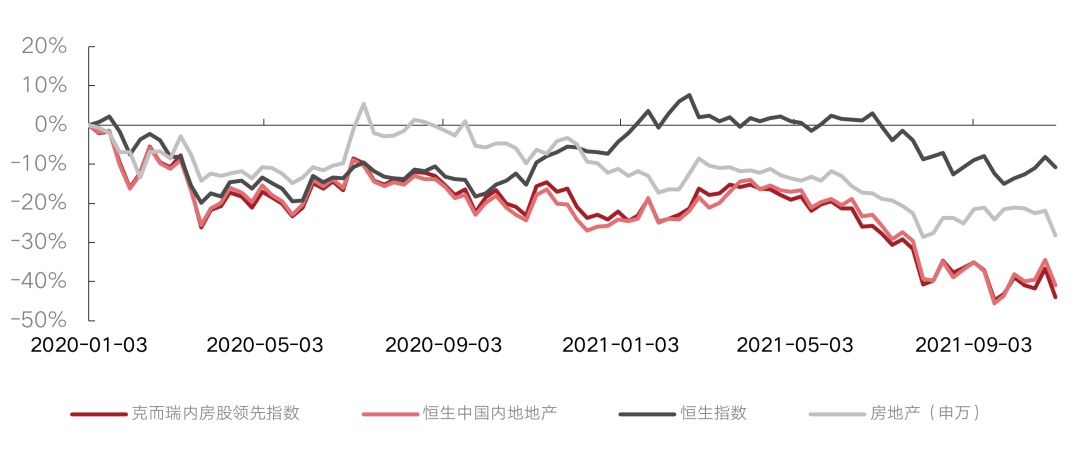 自2020年1月1日至今,克而瑞內房股領先指數(shù)跌幅44.0%,同期恒生中國內地地產指數(shù)跌幅41.0%。恒生指數(shù)跌幅10.8%,房地產(申萬)板塊跌幅28.2%。2021年10月,恒生指數(shù)上漲3.3%,克而瑞內房股領先指數(shù)下降8.5%,恒生中國內地地產指數(shù)下降4.7%,房地產(申萬)板塊下降8.9%。