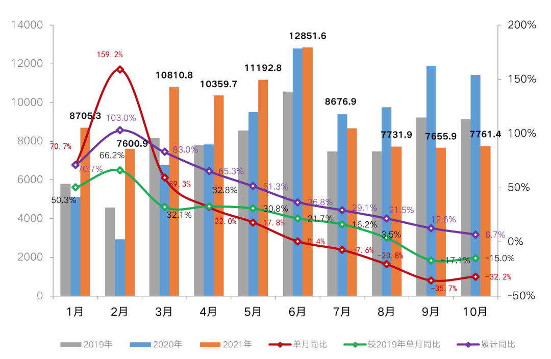 2021年10月,典型城市商品住宅成交熱度延續(xù)低位波動,整體市場壓力較大,傳統(tǒng)房地產旺季“金九銀十”失約,百強房企單月業(yè)績表現(xiàn)也不樂觀,10月,百強房企實現(xiàn)銷售操盤金額7761.4億元,受下半年市場明顯降溫的影響,10月單月業(yè)績同比去年同期延續(xù)了自7月以來的下跌趨勢。