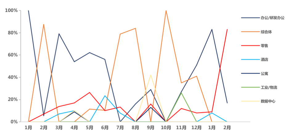 一線城市新興商務(wù)區(qū)的優(yōu)質(zhì)寫字樓以及運(yùn)營(yíng)表現(xiàn)優(yōu)異、回報(bào)穩(wěn)定的商業(yè)資產(chǎn)受到資本青睞。1月,辦公/研發(fā)辦公業(yè)態(tài)成交占比超80%,為絕對(duì)主力;2月,受上海商業(yè)成交占比提升影響,一線城市整體商業(yè)占比大幅提升,為近一年來最高值。