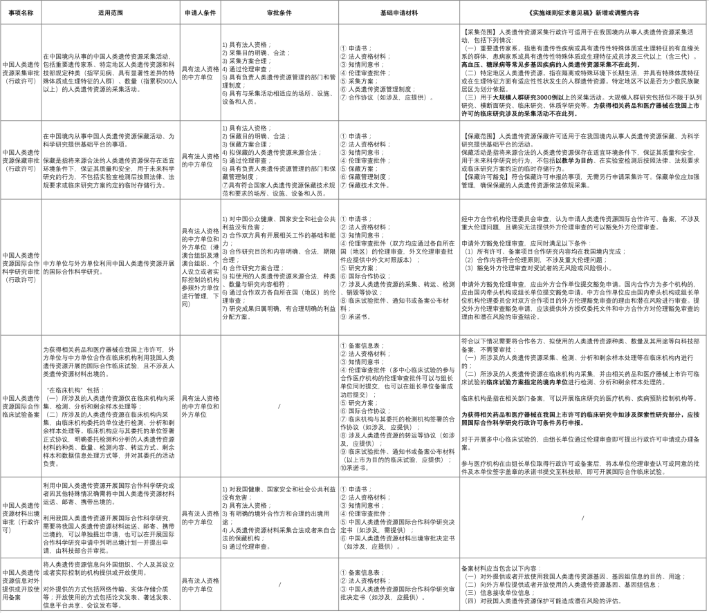 目前,科技部將我國(guó)人類遺傳資源管理主要?jiǎng)澐譃椴杉⒈2亍?guó)際合作科學(xué)研究、材料出境四個(gè)審批(行政許可)事項(xiàng),和國(guó)際合作臨床試驗(yàn)、信息對(duì)外提供或開(kāi)放使用兩個(gè)備案事項(xiàng)。為便于相關(guān)單位比照自身情況來(lái)確定相應(yīng)的行政許可事項(xiàng),筆者根據(jù)相關(guān)法律規(guī)定及科技部發(fā)布的服務(wù)指南制作列表如下: