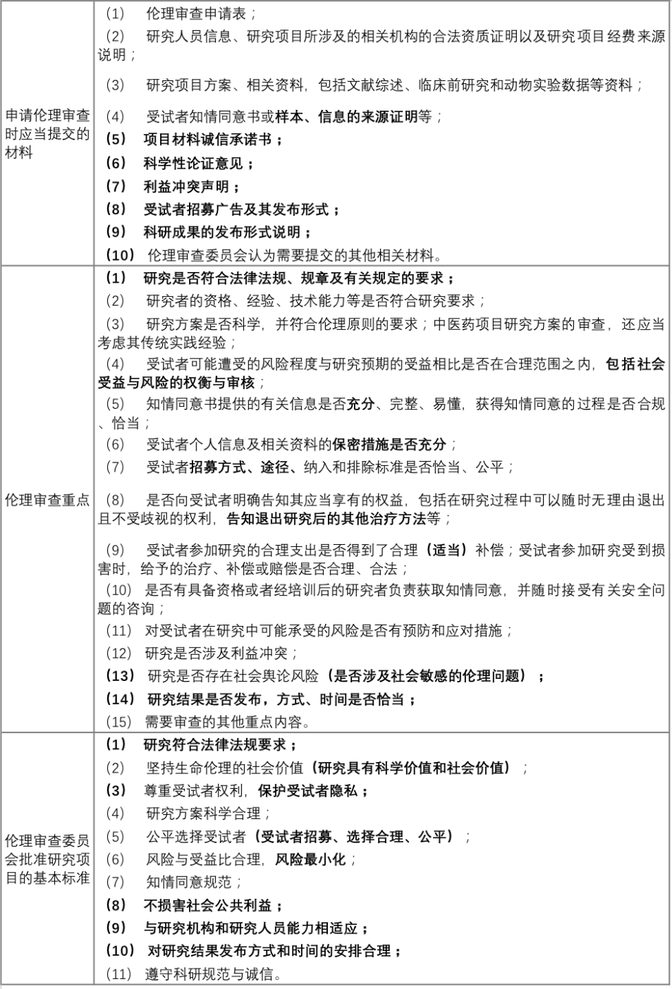 筆者現(xiàn)就倫理審查過(guò)程中需要提交的材料、審查重點(diǎn)以及審批標(biāo)準(zhǔn)列表如下(其中的粗體部分,為《涉及人的生命科學(xué)和醫(yī)學(xué)研究倫理審查辦法(征求意見(jiàn)稿)》相較于現(xiàn)行《涉及人的生物醫(yī)學(xué)研究倫理審查辦法》新增或調(diào)整的內(nèi)容):