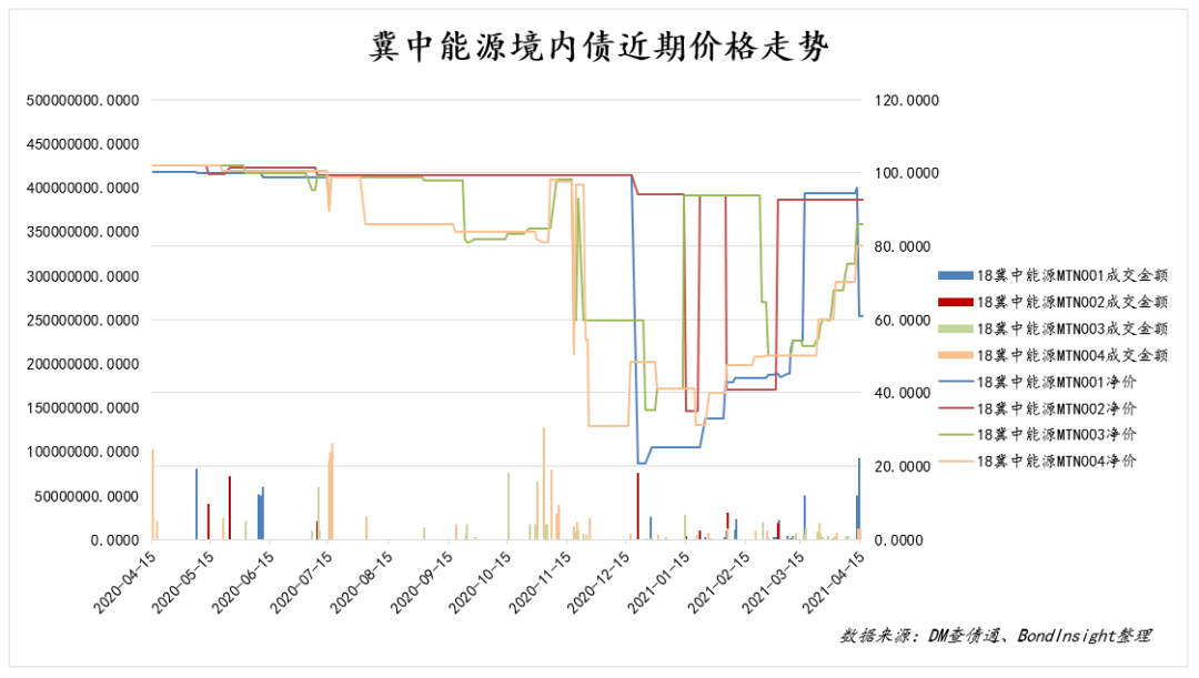 18冀中能源MTN004 (101801319.IB):截至目前,該債收盤凈價(jià)為80.1元,較上一筆收盤價(jià)70.2上漲14.10%。從走勢來看,該債券自2020年11月末驟跌至歷史最低價(jià)31元后價(jià)格緩慢攀升,于今年三月末發(fā)生價(jià)格三連跳,收盤凈價(jià)在20天內(nèi)自50.2元回升至80.1水平。成交收益率下降至47.78%,偏離中債估值1,376.11bps。截至4月15日收盤,4月成交額共0.3103億元。