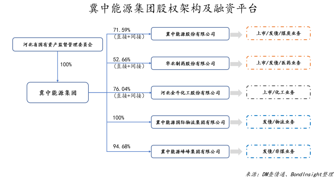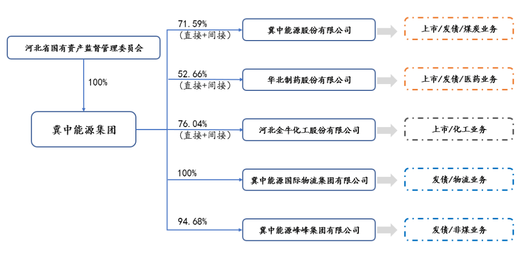 公司旗下?lián)碛腥疑鲜凶庸荆謩e為冀中能源股份有限公司(股票簡稱“冀中能源”,股票代碼“000937.SZ”,以下簡稱“冀中股份”)、華北制藥股份有限公司(股票簡稱“華北制藥”,股票代碼“600812.SH”)和河北金牛化工股份有限公司(股票簡稱“金牛化工”,股票代碼“600722.SH”)。截至2020年11月末,公司以直接和間接方式持有上述上市子公司的股權(quán)比例分別為71.59%、52.66%和76.04%,三者分別是公司煤炭業(yè)務(wù)、醫(yī)藥業(yè)務(wù)和非煤化工業(yè)務(wù)的經(jīng)營主體。