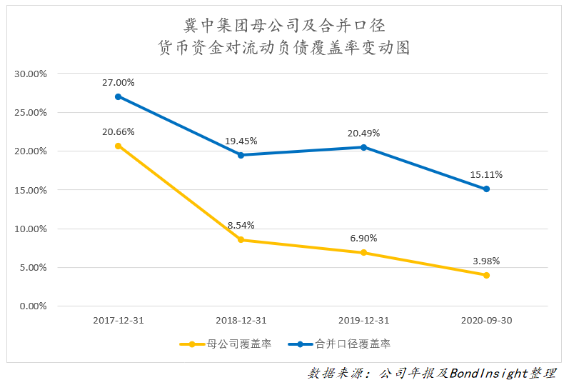 在現(xiàn)金層面,冀中集團(tuán)貨幣資金對流動負(fù)債覆蓋率一路猛跌。從母公司口徑來看,在2017年末,公司貨幣資金尚能覆蓋20.66%的流動負(fù)債,但截至2020年Q3,母公司流動負(fù)債已增長至657.93億,可支配資金僅為26.19億,覆蓋率僅剩3.98%。從合并口徑出發(fā),2020年Q3公司賬上貨幣資金達(dá)163.54億元,覆蓋率仍有15.11%。截至2021年4月,集團(tuán)存續(xù)債券規(guī)模為234.7億,貨幣資金缺口較大。