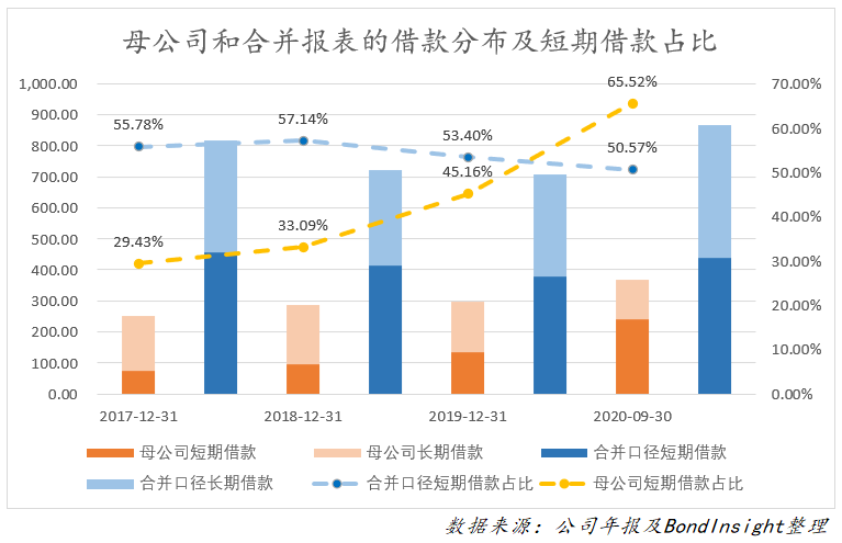 2020年三季度公司借款總和較年初增長22.56%至866.66億元,其中長期借款增幅最為明顯,較年初增長29.99%至428億元,從金額匹配上看,以貸款方式兌付有息債券可能性較大。合并口徑下2020Q3短期借款占比下降至50.57%,公司長/短期借款分布較為均勻。但母公司口徑下,四年來短期借款占比以平均每年9%的速度增加,趨勢與合并口徑相反,集團(tuán)增長的短期債務(wù)主要集中在母公司身上。