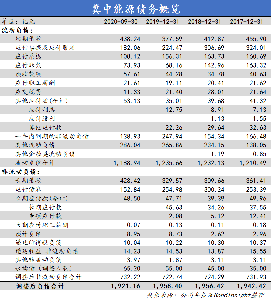 公司2020年三季度總資產(chǎn)2,277.05億,未將永續(xù)債調(diào)整入表前,三季度總負(fù)債較年初下降2.49%至1,855.96億元,資產(chǎn)負(fù)債率下降至81.51%,為近三年最低值。將永續(xù)債調(diào)整入表后,總負(fù)債較之前增加3.51%至1,921.15億,資產(chǎn)負(fù)債率升高至84.37%,幾乎與2018年末持平。