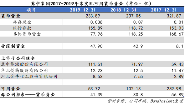 值得注意的是,集團(tuán)歷年可用資金呈現(xiàn)明顯的大幅下降趨勢,2019年末可用資金僅相當(dāng)于2017年末可用資金的22.39%,三年內(nèi)平均降幅達(dá)52.42%。與之相對的,旗下上市子公司冀中能源現(xiàn)金增幅明顯,2019年末貨幣資金達(dá)111.51億,較2017年的59.43億增長87.63%。