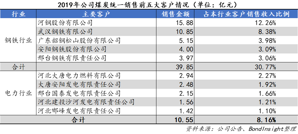 發(fā)行人煤炭主要銷往河北省、河南省、山西省、內(nèi)蒙古、山東省及周邊地區(qū),下游客戶以華北、華中、華南地區(qū)的大型鋼廠、焦化廠、電廠為主,其中主要為大型鋼廠。2019年前五名鋼鐵客戶的銷售占比為30.77%;前五名電力客戶的銷售占比為8.16%,發(fā)行人與主要客戶合作關(guān)系穩(wěn)定,煤炭銷售規(guī)模有一定保障,主要客戶情況如下表所示: