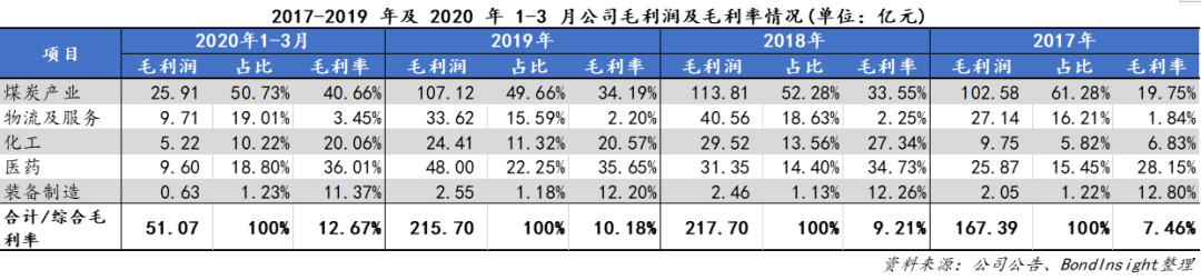 2017-2019年及2020年1-3月,公司分別實(shí)現(xiàn)毛利潤167.40億元、217.70億元、215.70億元和51.07億元。煤炭產(chǎn)業(yè)是公司毛利潤的主要來源,在其中分別占比為61.28%、52.28%、49.66%和50.73%。近兩年煤炭產(chǎn)業(yè)毛利潤有所提升,主要由于煤炭價(jià)格保持在較高水平。2017-2019年及2020年1-3月,公司毛利率分別為7.46%、9.21%、10.18%和12.67%,呈上升趨勢,經(jīng)營活動能產(chǎn)生一定盈利,但盈利水平較低,自身造血能力較差。具體情況如下表所示: