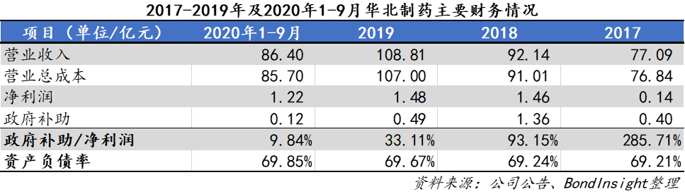 2017-2019年公司化學(xué)制劑藥和生物制劑收入持續(xù)提升,上升約41.15%,醫(yī)藥業(yè)務(wù)收入較快增長;但凈利潤未發(fā)生較明顯增幅,近三年均在1.5億元左右,其中2018年政府補(bǔ)助對凈利潤的覆蓋程度達(dá)到93.15%,雖逐年下降,公司對政府補(bǔ)助依賴性仍然較大,經(jīng)營效益差;公司資產(chǎn)負(fù)債率維持在69%,負(fù)債水平較高。主要財(cái)務(wù)情況如下表所示: