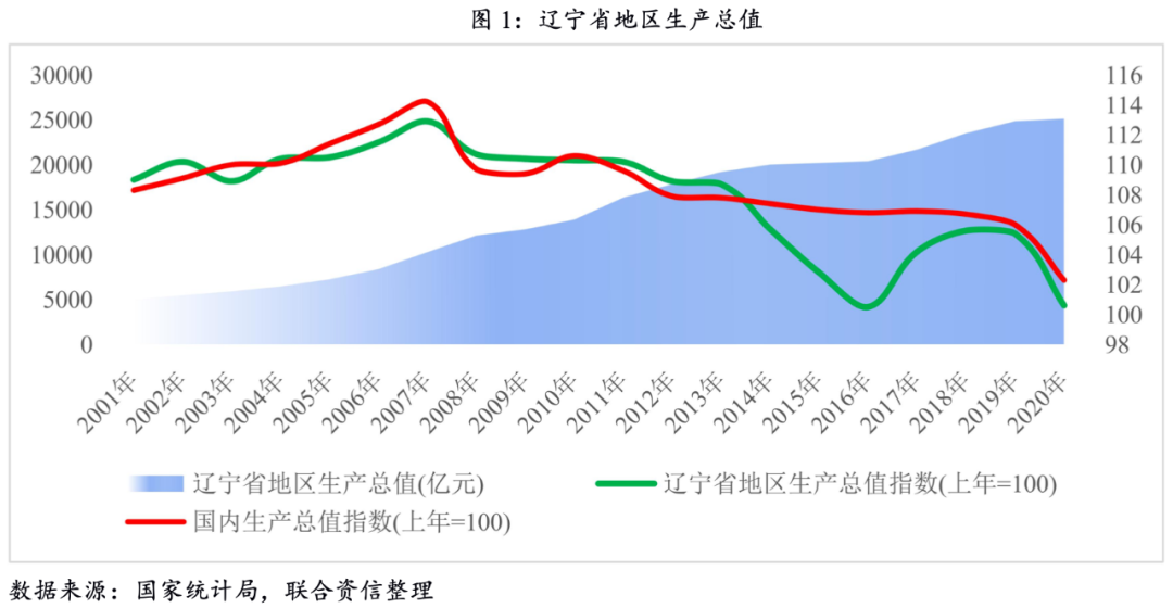 遼寧省在裝備制造、石化、冶金等領(lǐng)域產(chǎn)業(yè)實(shí)力較為雄厚,作為新中國(guó)工業(yè)搖籃,遼寧省為國(guó)家的改革開放和現(xiàn)代化建設(shè)做出了重大貢獻(xiàn)。但近年來,受體制機(jī)制性矛盾、傳統(tǒng)產(chǎn)業(yè)轉(zhuǎn)型升級(jí)困難、人口流失等因素影響,遼寧省內(nèi)經(jīng)濟(jì)實(shí)體經(jīng)營(yíng)壓力持續(xù)加大,區(qū)域經(jīng)濟(jì)增長(zhǎng)承壓。從數(shù)據(jù)上看,2016—2020年,遼寧省地區(qū)生產(chǎn)總值增速同比增長(zhǎng)分別為-2.5%、4.2%、5.7%、5.5%和0.6%,均低于國(guó)內(nèi)生產(chǎn)總值增速;從遼寧省國(guó)內(nèi)生產(chǎn)總值在全國(guó)省份的排名情況來看,遼寧省在全國(guó)31個(gè)省市自治區(qū)的GDP排名也在不斷下降,2010年遼寧省GDP總量在31個(gè)省(自治區(qū)、直轄市)排名第7位,而2020年排名降至第16位。