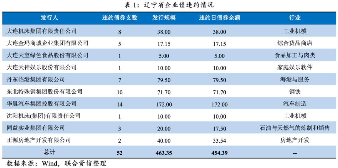根據(jù)Wind數(shù)據(jù)顯示,截至2021年11月末,遼寧省內(nèi)企業(yè)債券違約主體10家,涉及債券52支,債券違約余額454.39億元,余額違約率為17.42%。除此之外,沈陽機(jī)床股份有限公司發(fā)行的中期票據(jù)通過現(xiàn)金、留債、股票等方式進(jìn)行了債券清償;沈陽盛京能源發(fā)展集團(tuán)有限公司發(fā)行的定向融資工具已由第三方代償,并未計(jì)入上述統(tǒng)計(jì)。從違約主體行業(yè)分布情況來看,遼寧省違約企業(yè)涉及汽車、石油化工、工業(yè)機(jī)械、海港、鋼鐵、房地產(chǎn)開發(fā)等領(lǐng)域,企業(yè)性質(zhì)涉及地方國(guó)有企業(yè)及民營(yíng)企業(yè)。