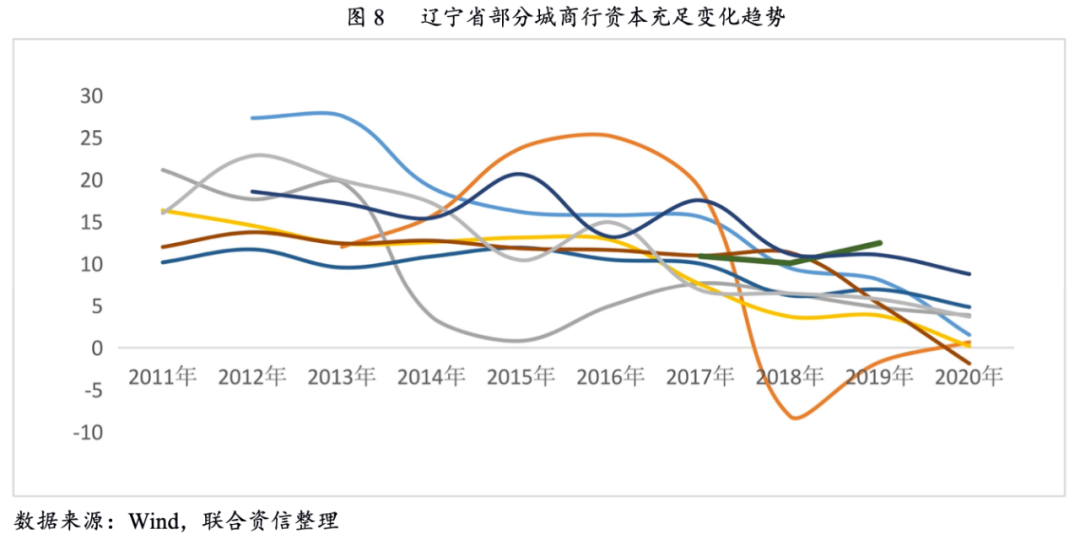 資產(chǎn)充足水平方面,近年來,遼寧省城商行通過利潤(rùn)留存、增資擴(kuò)股以及發(fā)行二級(jí)資本債券、優(yōu)先股等手段補(bǔ)充資本,整體資本水平較為充足,但部分城商行資本充足水平出現(xiàn)一定程度的下降。一方面,受盈利水平下滑的影響,部分城商行資本內(nèi)生能力有所減弱;另一方面,部分城商行信貸資產(chǎn)質(zhì)量下行導(dǎo)致?lián)軅渌讲蛔悖瑢?duì)資本造成較大的沖減,資本面臨補(bǔ)充壓力。