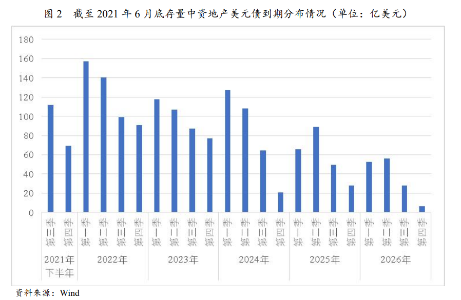 從未來的到期情況看,未來1年房企大量美元債密集到期。截至2021年6月底,未來12個月內(nèi)逾478億美元債務(wù)面臨到期,其中2022年1季度到期規(guī)模最大,再融資需求大。若市場持續(xù)大幅波動,將進一步加劇房地產(chǎn)企業(yè)再融資壓力。