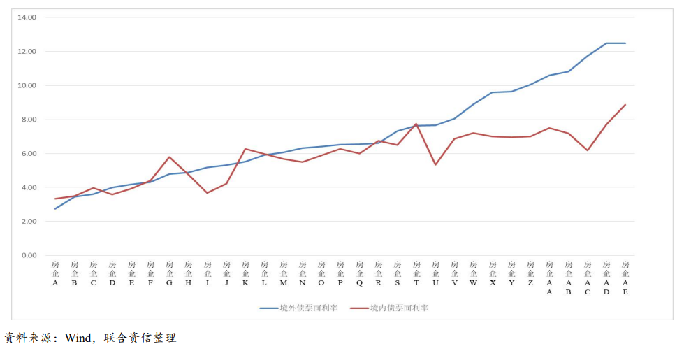 由于部分房地產(chǎn)企業(yè)綜合融資成本難以獲取,我們采用其債券發(fā)行票面利率作為篩選標(biāo)準(zhǔn)。我們以2020年以來,境內(nèi)外市場同時發(fā)行債券的企業(yè)為研究對象,對其發(fā)行債券的票面利率做簡單的算數(shù)平均進行對比。考慮到境外美元債償債資金來源除借新還舊外,實質(zhì)來自于境內(nèi)公司,因此我們主要選取更能反映公司的真實信用風(fēng)險的境外控股公司作為分析標(biāo)的,詳見下圖。
