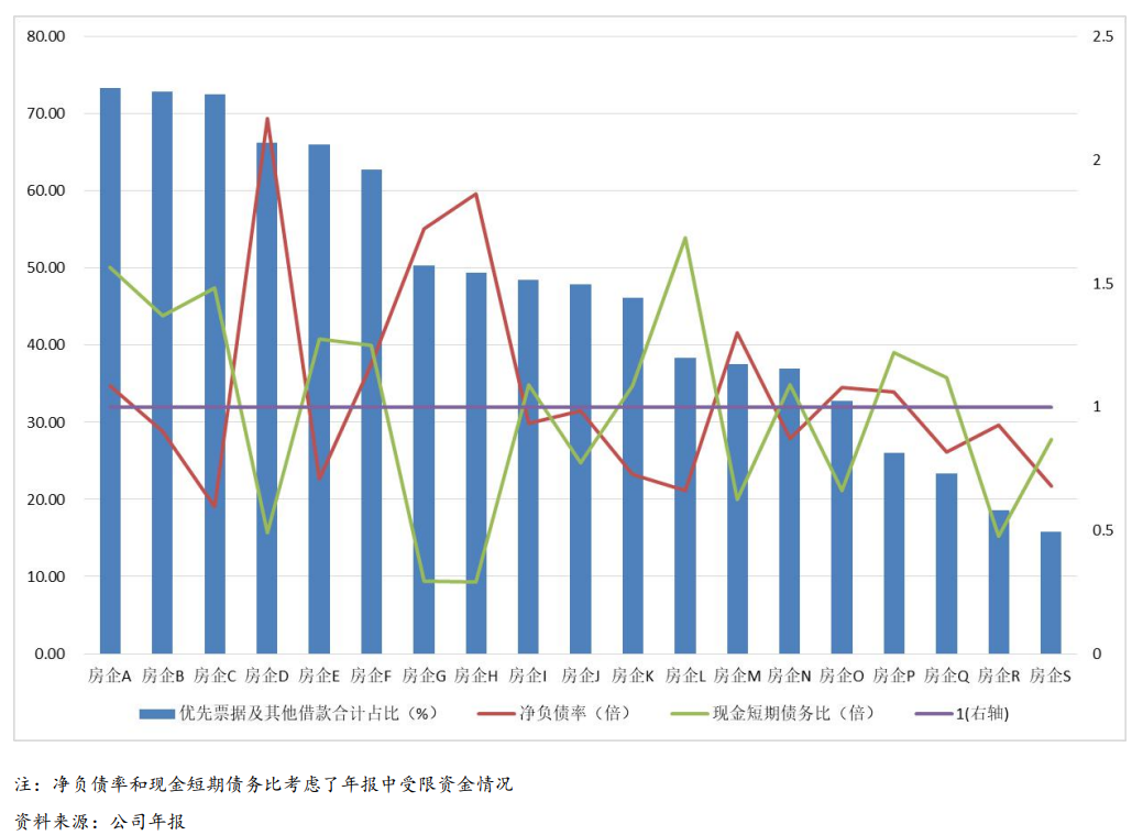 我們認(rèn)為,融資渠道中高成本的優(yōu)先票據(jù)及其他借款(以信托和資管計劃等非標(biāo)融資為主)合計占比較高,一定程度上能反映出公司境內(nèi)銀行和公開市場融資難度大。另一方面,美元債發(fā)行及交易影響因素多,二級市場價格波動可能會引發(fā)公司提前贖回債券,從而影響公司正常的資金安排;此外,國家相關(guān)政策在收縮非標(biāo)融資規(guī)模,長遠(yuǎn)看房地產(chǎn)企業(yè)非標(biāo)融資難度也將越來越大。因此,優(yōu)先票據(jù)及其他借款占比高,可能預(yù)示著公司的潛在信用風(fēng)險較大。