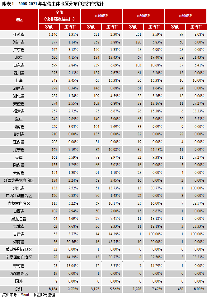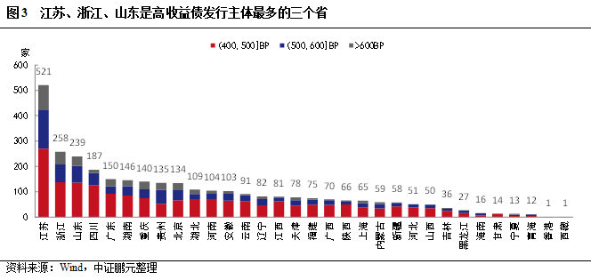 我們再來看一下高收益債發行主體在各地區的分布和違約特征。從絕對數量來看(圖3),江蘇是高收益債主體的絕對大省,主體數量高達521家,是第二名的兩倍之多,占整體高收益債主體的16.4%;其次是浙江和山東,均在200家以上。在利差>400BP(圖5)、>500BP(圖6)、>600BP(圖7)三組高收益主體中,江蘇、浙江、山東均是排名前三。重慶以140家躍居第七名,其它網紅地區如貴州、云南、天津則分別以135家、91家、78家分居第八、十三、十六位。