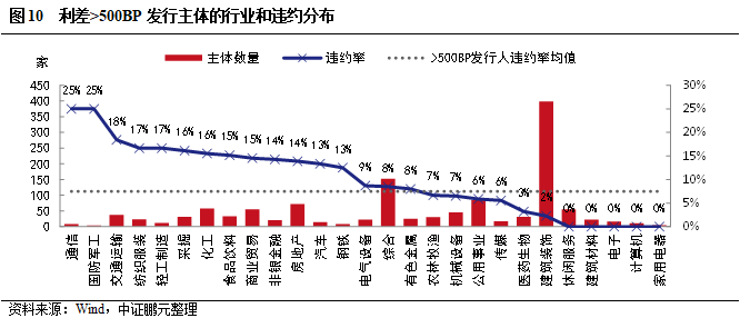 行業分布和違約特征方面,從統計數據來看,建筑裝飾是高收益主體數量最多的行業,僅其一個行業就占全部高收益主體的35%;其次是綜合、房地產、公用事業,也是一級市場高收益債發行主體的主要分布行業(圖8)。前四個行業占全部高收益主體的60%。但建筑裝飾、綜合行業的高收益主體中有較大比例為城投,也就是說有相當數量的弱資質城投其發行利差還是偏高的。