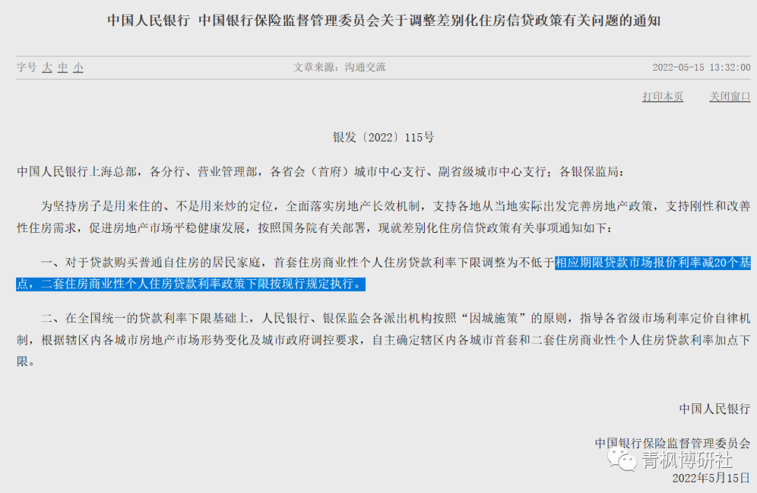 (一)2022年5月15日,央行和銀保監會聯合發布《關于調整差別化住房首套住房信貸政策有關問題的通知》(銀發(2022)115號),明確首套住房貸款利率下限調整為LPR-20BP,二套房貸款利率下限按現行規定執行。