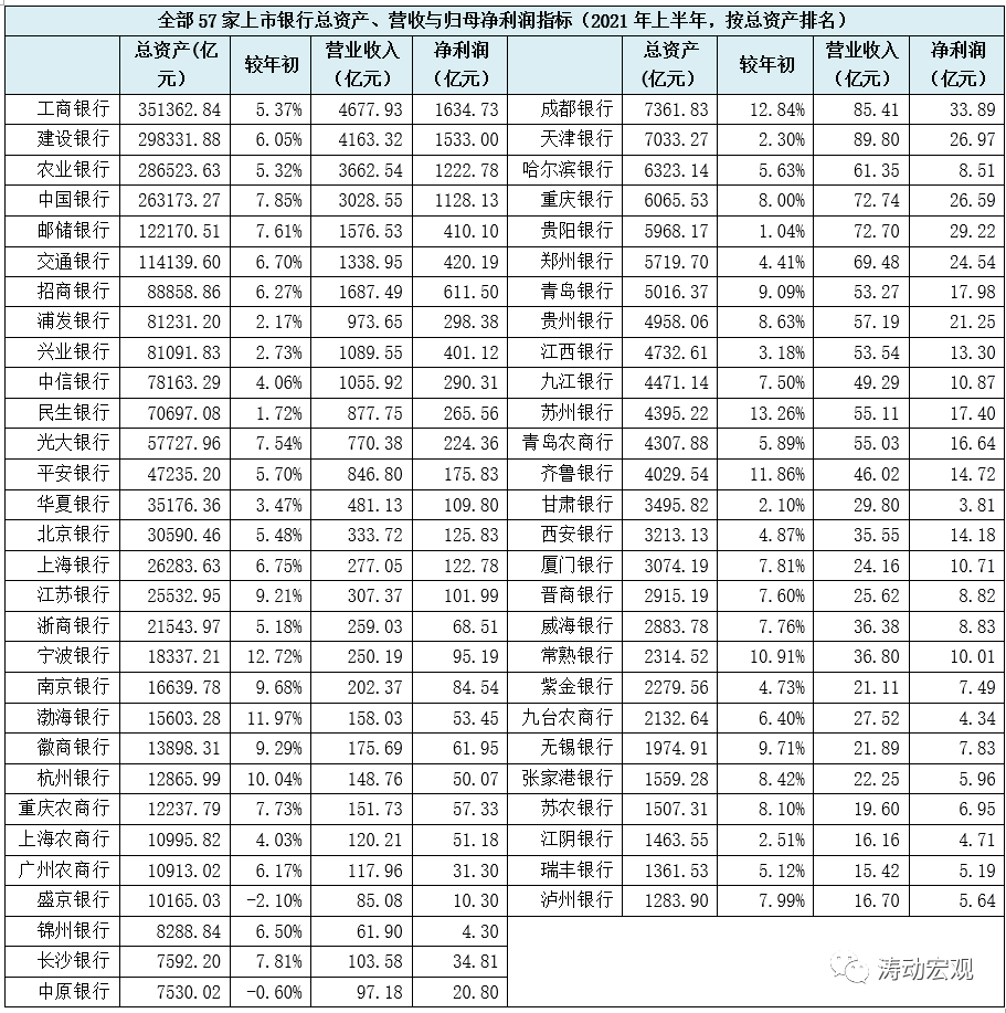 截至2021年6月底,57家上市銀行的總資產達到232.67萬億(國有行143.57萬億、股份行57.73萬億、城商行26.07萬億以及農商行5.30萬億),今年上半年分別實現營收和凈利潤為30250億元和10066.46億元。