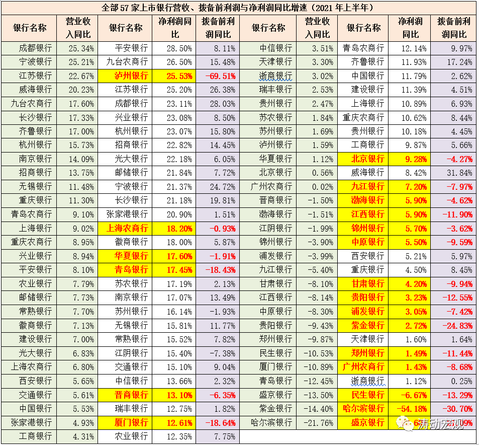 截至目前,除剛剛上市的上海農商行外(2021年8月19日上市),其余56家上市銀行均已公布2021年半年報。目前57家上市銀行具體包括6家國有大行、10家股份行(僅余廣發銀行與恒豐銀行未上市)、29家城商行以及12家農商行。此外,57家上市銀行可進一步分為15家A+H股上市銀行、26家純A股上市銀行、16家純H股上市銀行。整體來看,今年上半年上市銀行之間分化愈發明顯,部分銀行通過減少撥備計提來提高凈利潤同比增速。