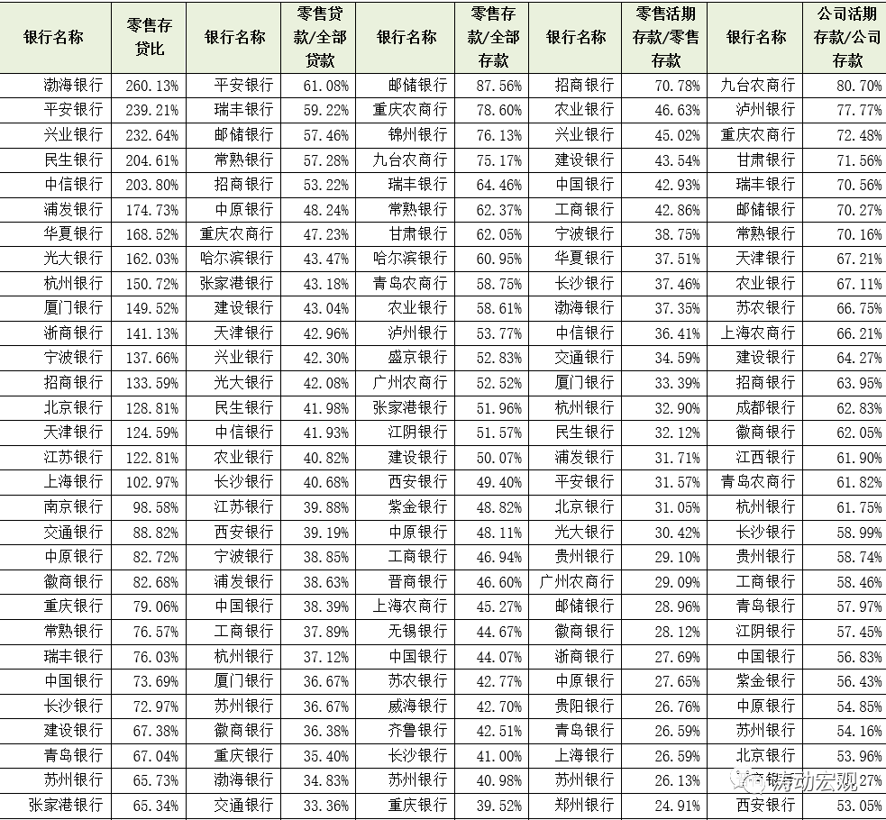 1、上市銀行的零售存貸比平均為76.04%,不過相較而言股份行的零售存貸比(高達190.65%)要遠遠高于其它類型銀行,農商行的零售存貸比最低(僅為44.62%),國有大行與城商行相當(分別為63.71%和68.23%)。這表明股份行實際上是以公司存款來支撐零售貸款的投放。