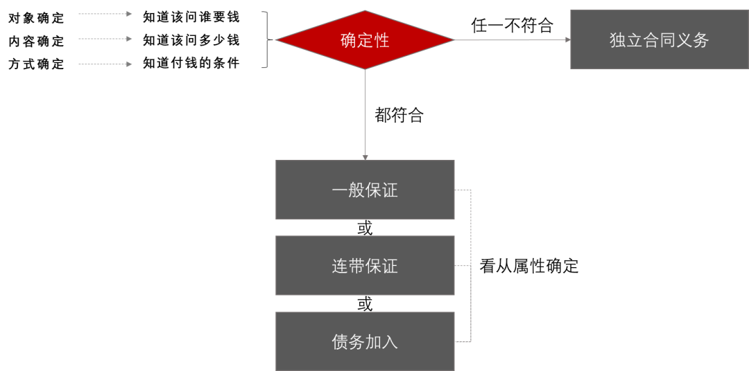 在上面我們學習了如何找主演,找到主演,那么就能排除獨立的合同義務——那么這個增信就只可能是一般保證、連帶保證5或者債務加入三種中的一種。