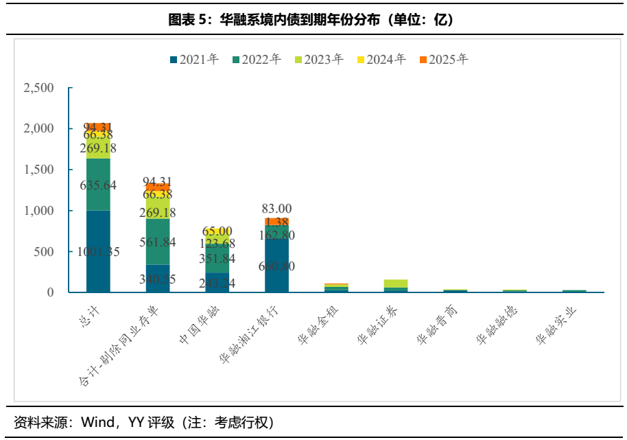 境內(nèi)債來(lái)看,華融系存續(xù)境內(nèi)債也集中在2021-2022年到期,2021年到期規(guī)模龐大,主因華融湘江銀行有660.80億的同業(yè)存單于2021年到期。在不考慮同業(yè)存單的情況下, 華融系2021-2023年分別有340.55億、561.84億和269.18億存續(xù)債到期,債務(wù)壓力很重。