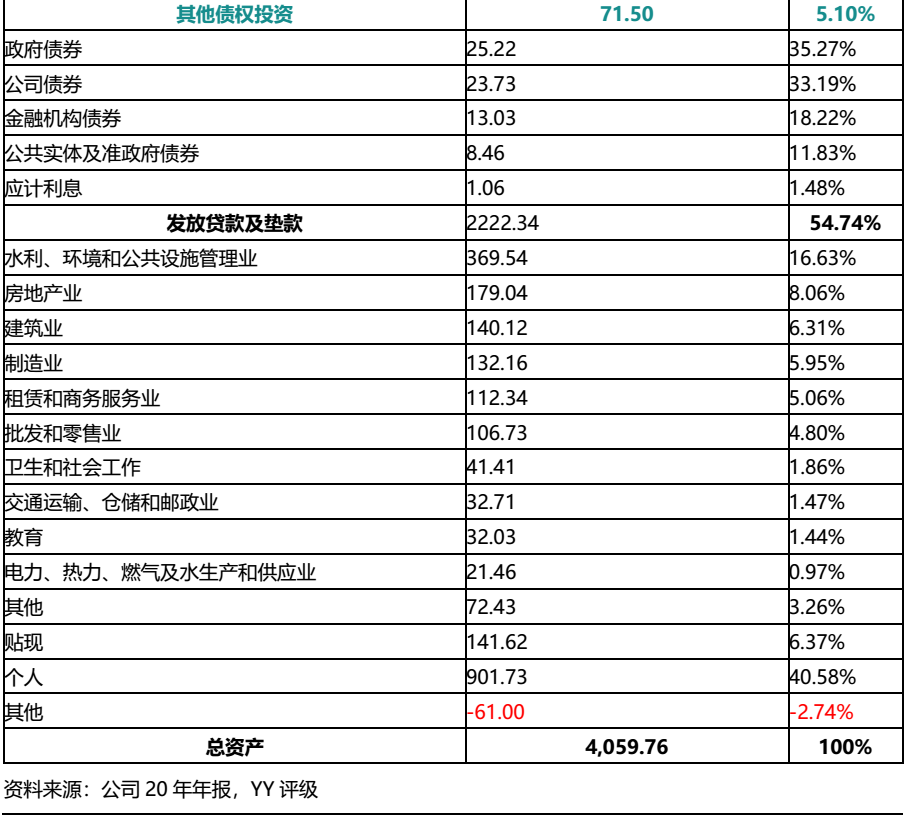 華融湘江銀行2020年資產(chǎn)總計(jì)4,059.76億元,主要由金融投資和發(fā)放貸款及墊款構(gòu)成,二者合計(jì)占比89.29%。其中金融投資主要為債權(quán)投資,從明細(xì)來(lái)看,華融湘江銀行金融投資主要投向債券類(lèi)資產(chǎn);發(fā)放貸款及墊款則主要面向個(gè)人,水利、環(huán)境和公共設(shè)施管理業(yè),房地產(chǎn),建筑業(yè)和制造業(yè)等行業(yè)。