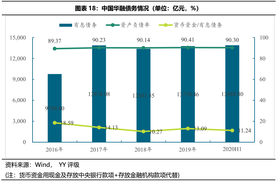 從負(fù)債率來(lái)看,華融系各公司負(fù)債率均超過(guò)了75%,華融實(shí)業(yè)財(cái)務(wù)杠桿更是高達(dá)95.67%,整體融資空間有限。從有息債務(wù)來(lái)看,中國(guó)華融有息債務(wù)規(guī)模高達(dá)13,888.80億元,占總資產(chǎn)的80.21%,貨幣資金/有息債務(wù)為11.24%,覆蓋程度較低。