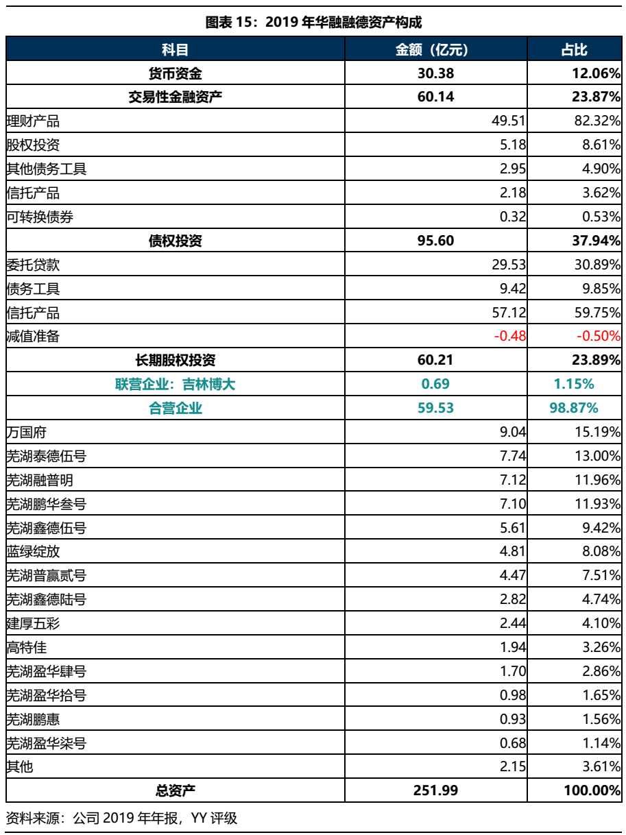 由于不再并表華融晉商,華融匯通資產(chǎn)規(guī)模2019年以來(lái)大幅下降,2020年6月末,公司總資產(chǎn)610.95億元,相較2018年總資產(chǎn)規(guī)模(1155.45億)近乎腰斬。從資產(chǎn)構(gòu)成來(lái)看,華融匯通資產(chǎn)以貨幣資金、交易性金融資產(chǎn)和債權(quán)投資為主,交易性金融資產(chǎn)主要投向股權(quán)、私募基金和信托產(chǎn)品;債權(quán)投資則以債權(quán)工具、不良債權(quán)投資及其他權(quán)益投資的資產(chǎn)管理計(jì)劃為主,整體以投資類(lèi)資產(chǎn)為主,需關(guān)注投資風(fēng)險(xiǎn)。