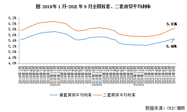 而從房貸利率層面,我們也不難看出端倪,受銀行信貸收緊影響,2月開始,全國房貸利率全面止跌回升,并趨勢性上移。據(jù)CRIC調(diào)研數(shù)據(jù),2021年9月,全國首套房平均房貸利率5.46%,較2020年底上漲23BP,二套房貸款平均利率5.83%,較2020年底上漲29BP。