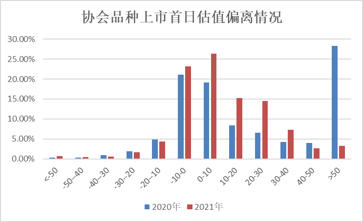 還是用數(shù)據(jù)說話,先來看看協(xié)會產(chǎn)品的上市首日估值和票面利率之差,2021年和2020年的對比情況??梢钥吹焦乐灯x在±10bp的市場化發(fā)行占比有了明顯提高,而偏離50bp這種極端行為(主要集中在scp上),占比從2020年的超過25%,下降到2021年的不足5%。
