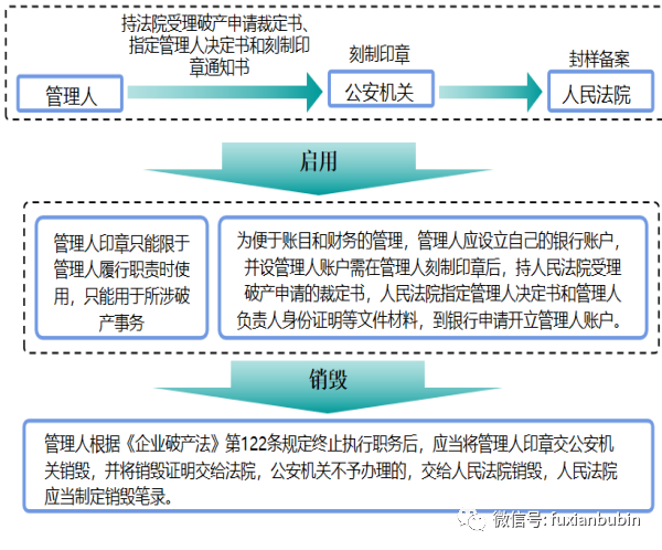 刻制印章(持法院受理破產(chǎn)申請裁定書、制定管理人決定書和刻制印章通知書到公安機(jī)關(guān)刻制,并到法院封樣備案,終止執(zhí)行職務(wù)時應(yīng)交公安機(jī)關(guān)銷毀),開設(shè)管理人賬戶(在管理人刻制印章后,持人民法院受理破產(chǎn)申請的裁定書,人民法院指定管理人決定書和管理人負(fù)責(zé)人身份證明等文件材料,到銀行申請開立管理人賬戶);管理人根據(jù)《企業(yè)破產(chǎn)法》第122條規(guī)定終止執(zhí)行職務(wù)后,應(yīng)當(dāng)將管理人印章交公安機(jī)關(guān)銷毀,并將銷毀證明交給法院,公安機(jī)關(guān)不予辦理的,交給人民法院銷毀,人民法院應(yīng)當(dāng)制定銷毀筆錄。